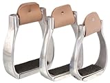 JT , High quality aluminum stirrups with rubber grip tread and spring loaded outside release for safety. When pressure is applied to outside of stirrup like in a fall the side of the stirrup will open all the way up allowing the foot to be released. No way to get hung up in these stirrups. Available in 3 great sizes for any age rider. The easy way out of a bad situation! Large size (5 x 5 inside measurement, 7 1/4 outside height, 4 1/4 x 1 3/4 tread, 1.8 lbs.) (Read More)